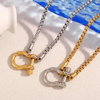 Square Pearl Chain Mixed Metal U-Buckle Necklace for Women, Waterproof Jewelry